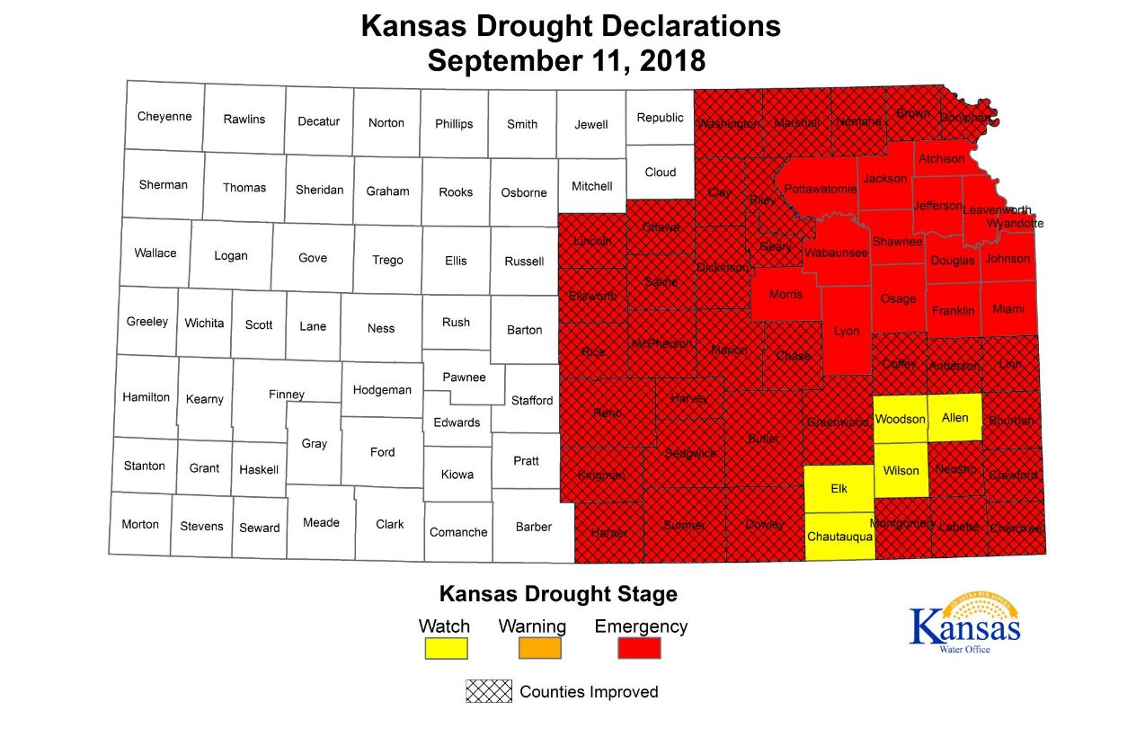 Drought Emergency: Anderson, Atchison, Bourbon, Brown, Butler, Cherokee, Clay, Coffey, Cowley, Crawford, Dickinson, Doniphan, Douglas, Ellsworth, Franklin, Geary, Greenwood, Harper, Harvey, Jackson, Jefferson, Johnson, Kingman, Labette, Leavenworth, Lincoln, Linn, Lyon, Marion, Marshall, McPherson, Miami, Montgomery, Morris, Nemaha, Neosho, Osage, Ottawa, Pawnee, Pottawatomie, Reno, Rice, Riley, Saline, Sedgwick, Shawnee, Sumner, Wabaunsee, Washington, Wyandotte