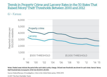 Kansas has raised its threshold for felony theft before — in 2004 — and related crime continued to decline, Pew says.