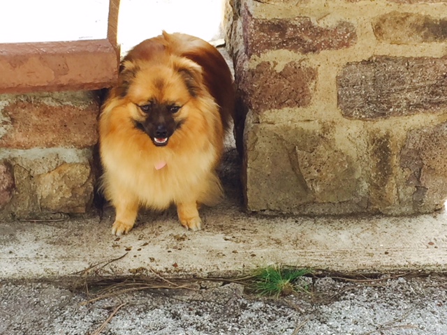 Sable is a 19-pound miniature pinscher-Pomeranian mix with a reddish-brown coat and two blond stripes across her shoulders. She is 3 years old.
