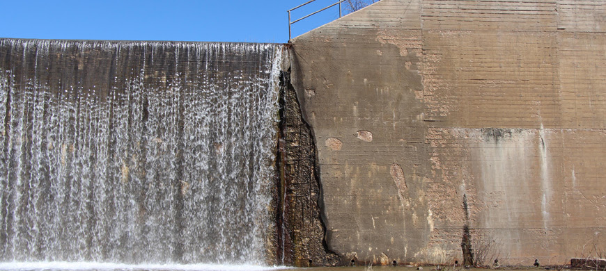 The project is necessary to repair parts of the spillway that have deteriorated or been damaged. There is some surface spalling and loose concrete, seepage through the side spillway walls and rebar and wire mesh is exposed. The concrete crib wall is failing – a lower section is missing, and there is bulging and settling. The project also includes maintenance work on the lower tower outlet gates, erosion repair at the outlet structure, cleaning sediment and brush out of the outlet channel, stabilizing banks on the west lake road and at the east abutment and replacing the low water crossing downstream of the spillway.