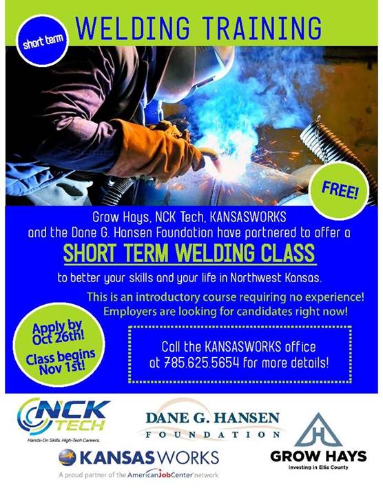 Grow Hays has partnered with NCK Tech and KansasWorks to offer a short-term welding training class. Deadline for applications is Friday.