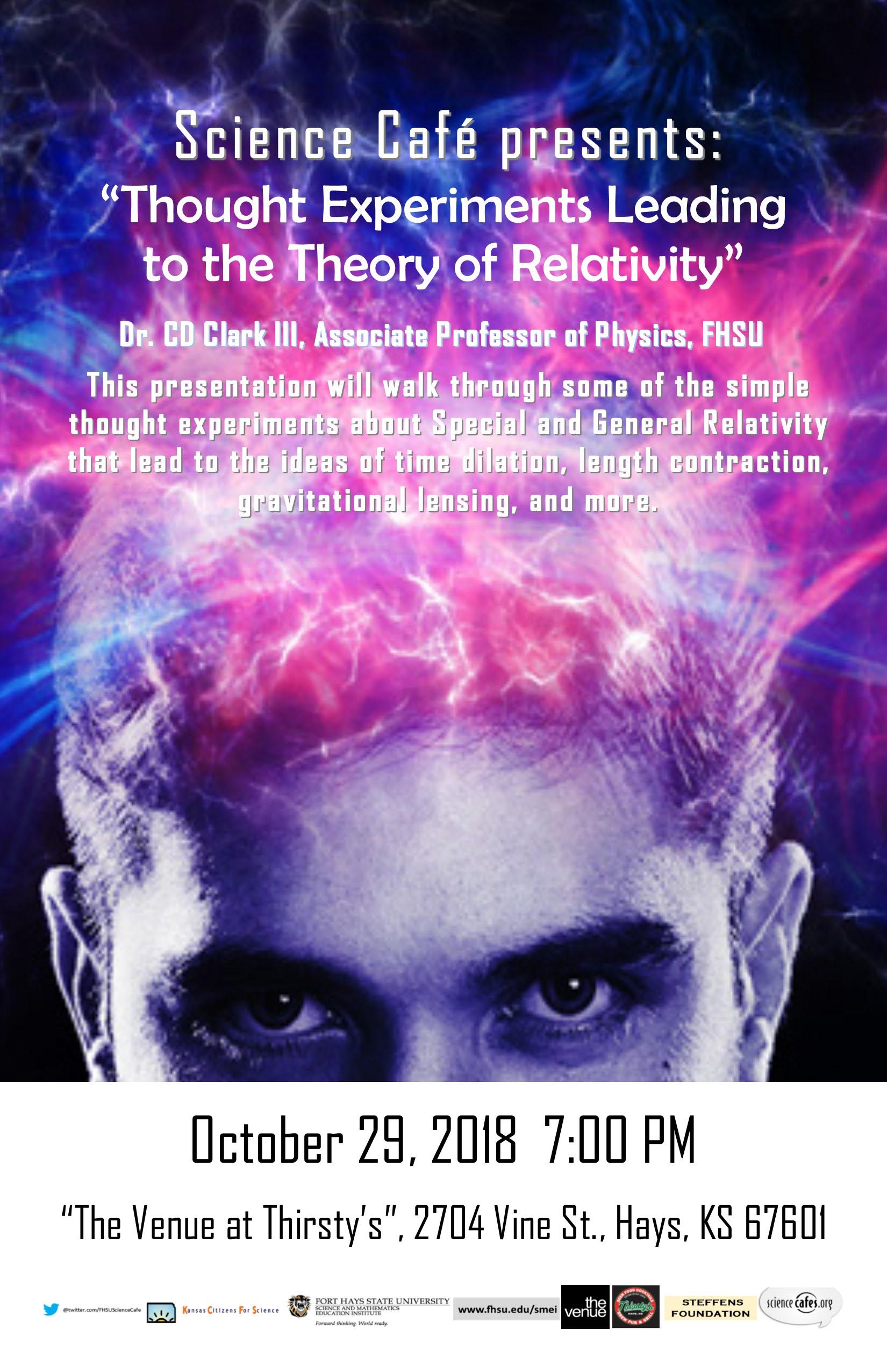 The Fort Hays State University Science and Mathematics Education Institute Science Café presents “Thought Experiments Leading to the Theory of Relativity” Monday, October 29 at 7 p.m. in The Venue at Thirstys, 2704 Vine Street.