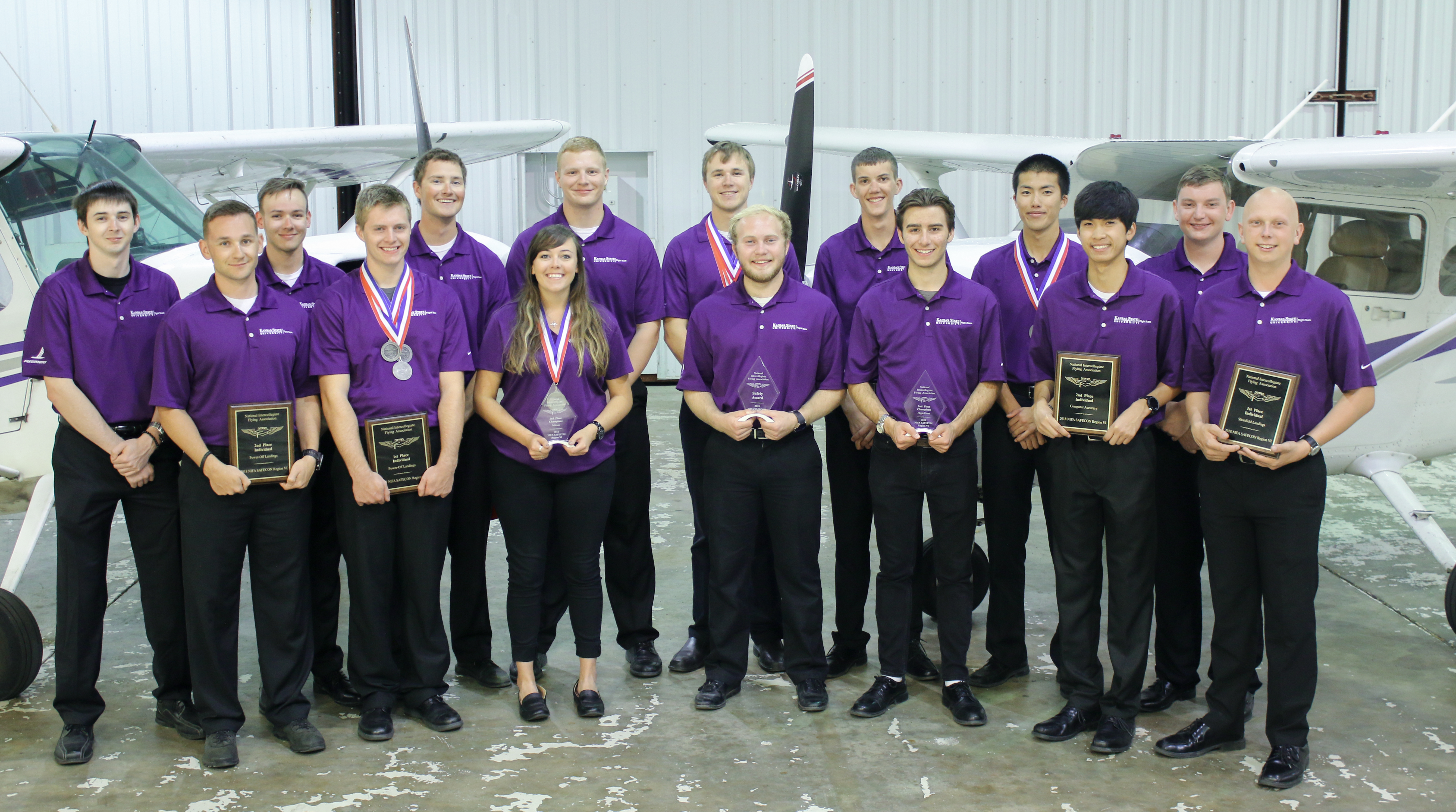 Members of the Kansas State Polytechnic Flight Team pose with their awards from the National Intercollegiate Flying Association SAFECON Region VI competition. Back row, from left: Jacob Hecker, Charles Weeks, Zach Smith, Robert Weesner, Caleb Strahm, Brent Koenigsman, Satoru Okada and Cole Thornberry; and front row, from left: Logan Klein, Marc Hinnen, team captain Maddie Perry, Grant Weldon, Conrad Giebler, Brandon Vu and Zak Kierstein. |