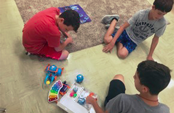 Members of the Tech Team work with the Dot and Dash robots at Hays Middle School.