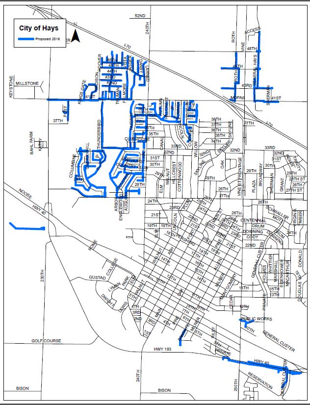 The city of Hays Water Resources Department has contracted with Pro-Pipe to conduct sewer line cleaning and inspections at the locations shown on the map. Cleaning will begin Monday, November 5, 2018. Pro-Pipe should be completed with the entire project on Friday, December 14, 2018.