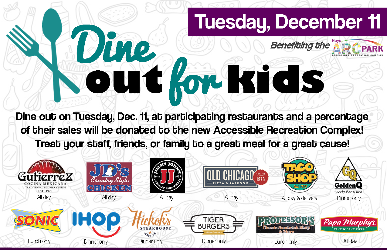 Where are YOU eating out on Dec. 11??  Treat your friends and family and benefit the #HaysARCPark on our citywide Dine Out Day! Special thanks to all of the participating restaurants. Please share and spread the word!! #DineoutforKids #EatoutlunchANDdinner
