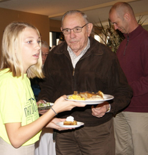 The students helped carry food to the tables, ate and visited with the guests, presented a program, and gave thank you cards from the students of the entire school.