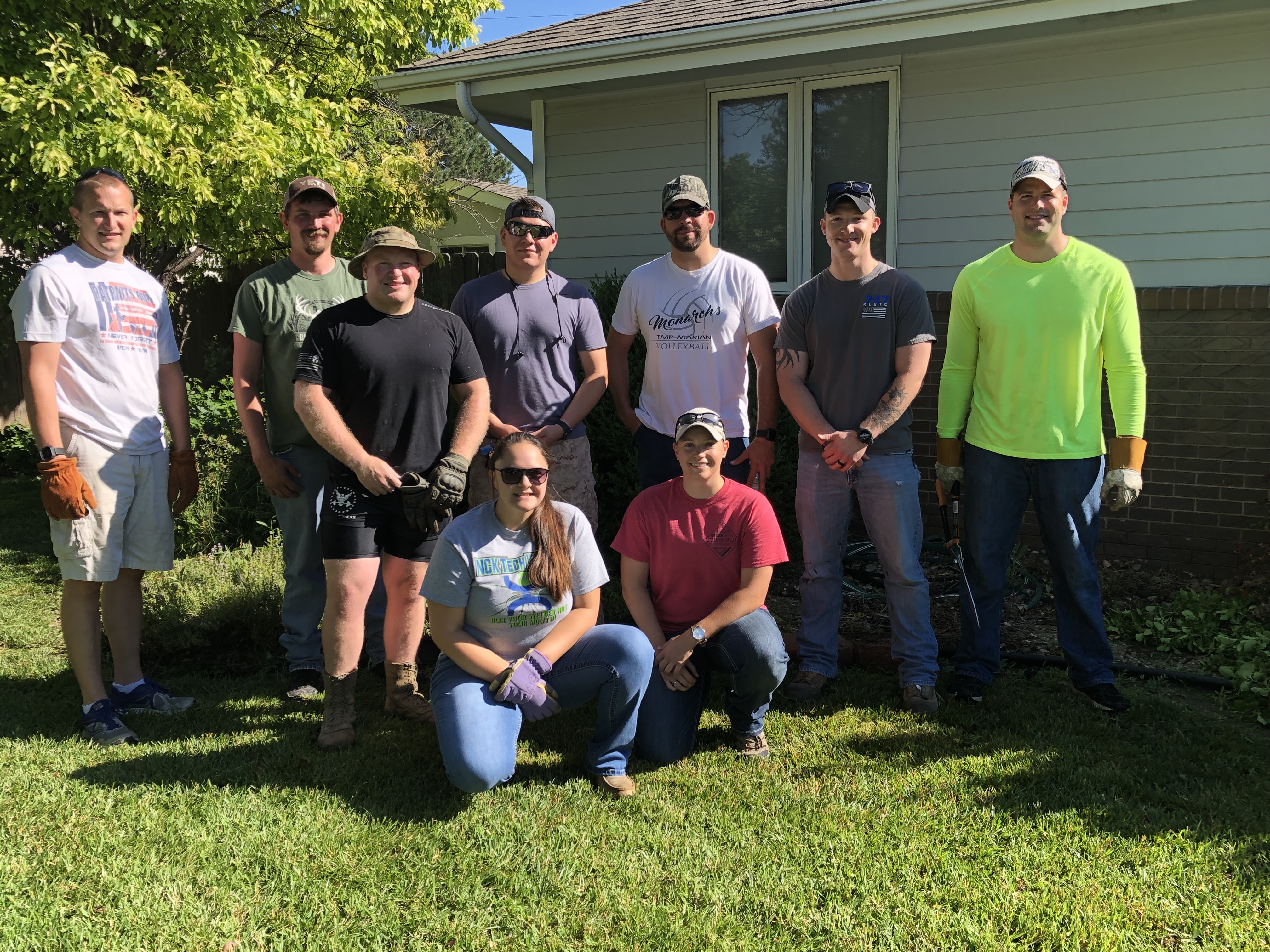 Hays Police Officer Ryan Blecha and the other members of his shift spent their day off doing lawn maintenance for 92-year-old Margaret Vine of Hays. (Back row L to R): Sgt. Brandon Hauptman, Dispatcher Josh Cooper, Ofc. Aaron Ewy, Ofc. Mackenzie Smith, Cpl. Vilaysing, Ofc. Ryan Blecha, Ofc. Scott Heimann (Kneeling) Dispatcher Alanna Hansen, Ofc. Samantha Nielsen