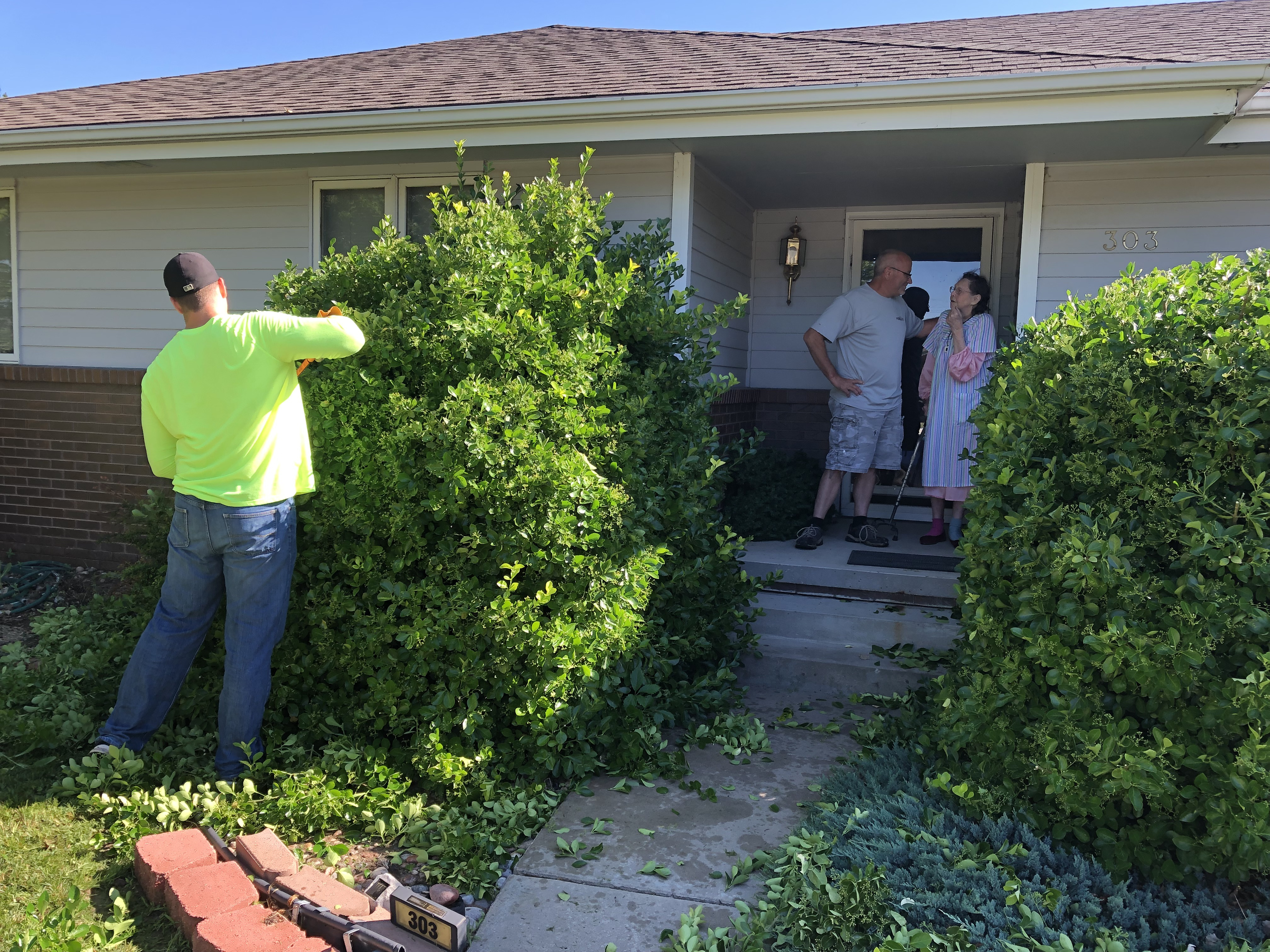 Budke, whose son is a Kansas Highway Patrol trooper in Goodland,  was also on hand during the lawn work, explaining to Margaret exactly what was going on.