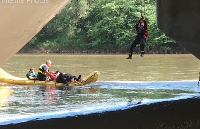 Coordinated efforts of all crews on scene, including Special Operations, led to the rescue of the mother, child and a small dog from the river. There were no injuries, according to Bevis.