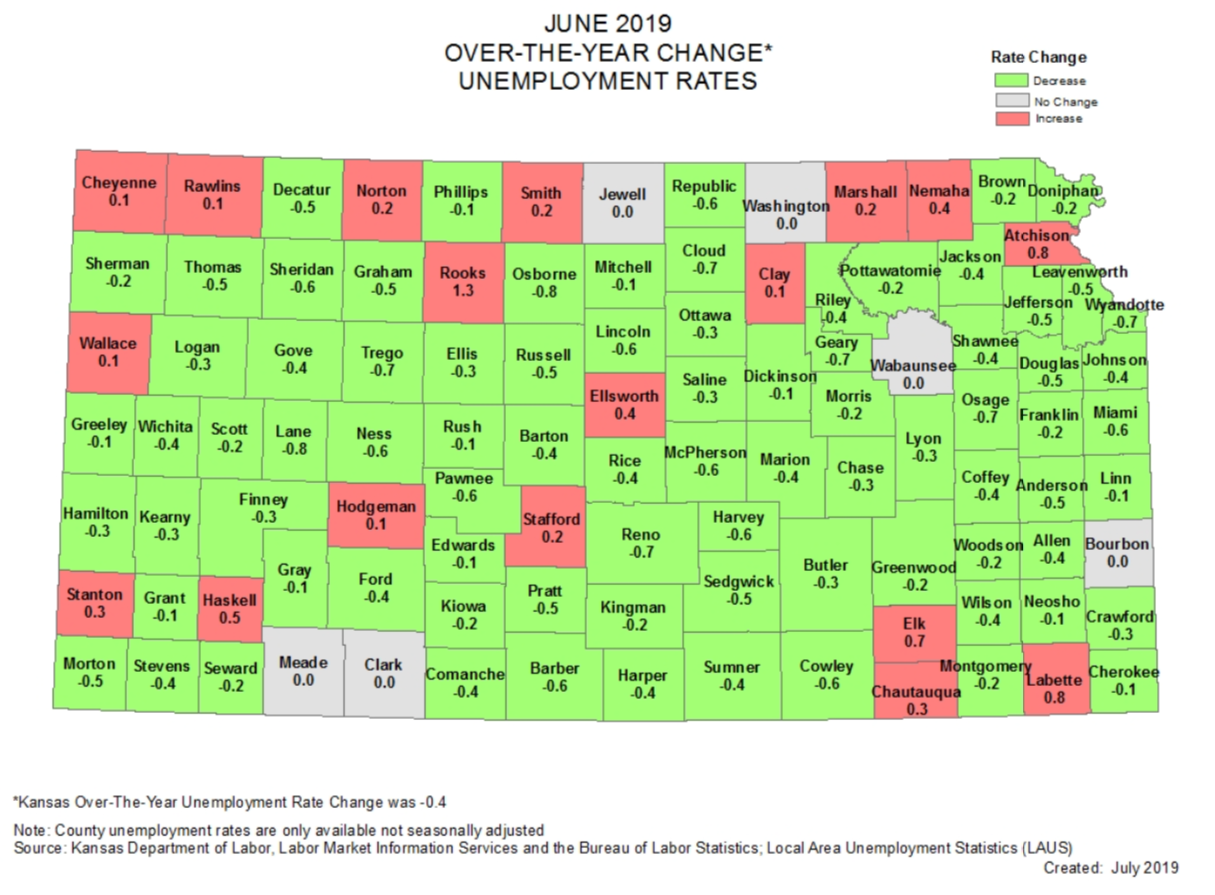 Preliminary estimates reported by the Kansas Department of Labor and Bureau of Labor Statistics show a seasonally adjusted unemployment rate of 3.4 percent in June. This was down from 3.5 percent in May and up from 3.3 percent in June 2018.