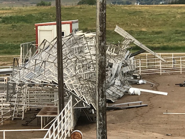 “It took a whole set of bleachers and lifted them up over the rodeo arena and smashed them against the crow’s nest and bucking shoots,” said Jill Pfannenstiel, fair board president. “They are totally destroyed.”