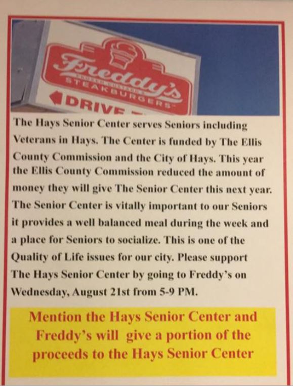 Freddy’s fundraiser for Hays Senior Center Aug. 21