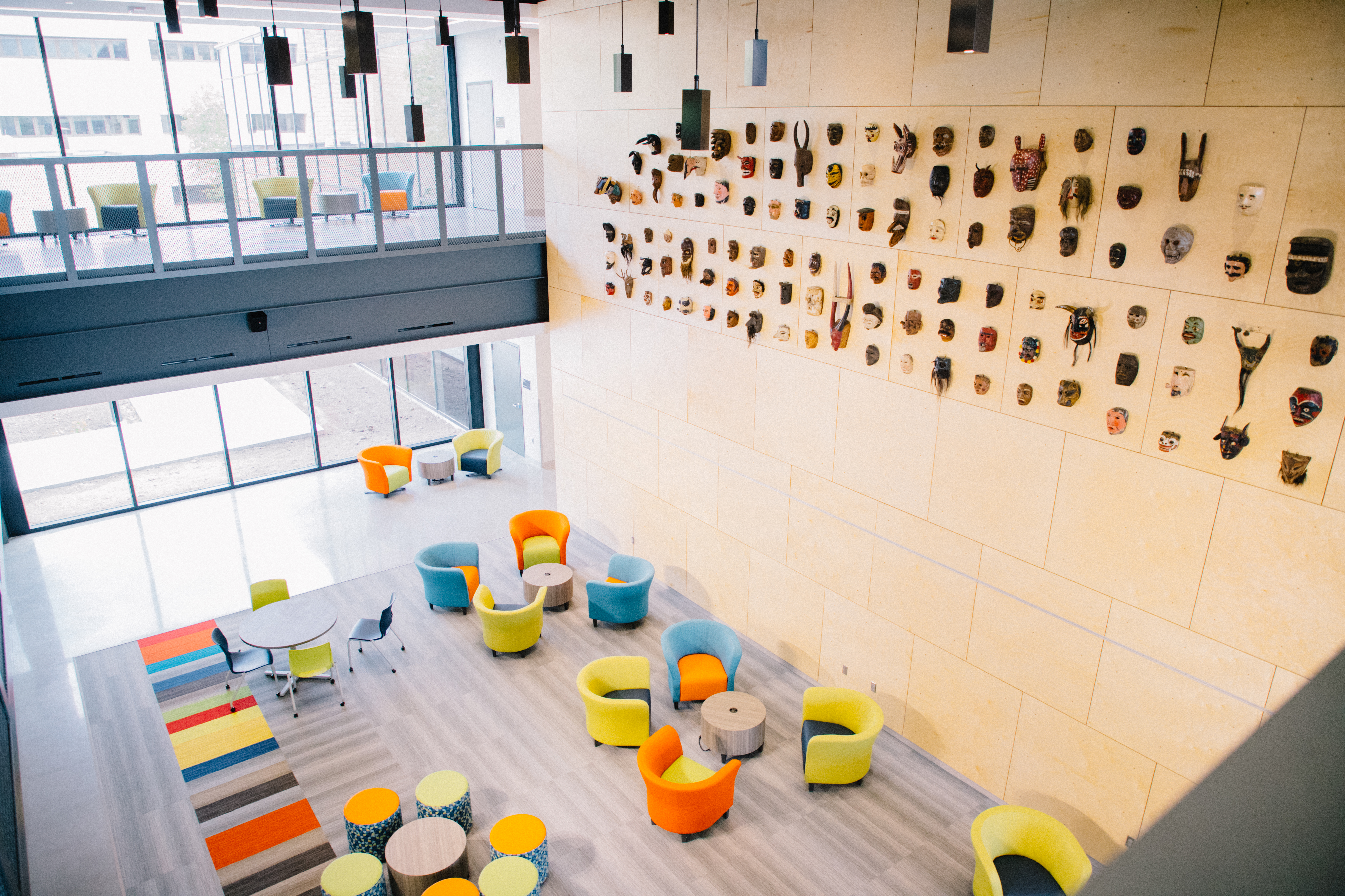 Now, they are able to enjoy the benefits of two large computer labs, along with the rest of the building. The second-floor atrium overlooks a large commons area below where multi-colored chairs invite students to sit and visit with others, rest, work on their laptops or merely take in their surroundings.