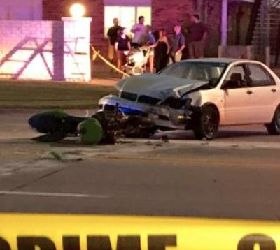 The motorcycle struck a 2003 Mitsubishi Lancer driven by a 45-year-old man who had pulled out of a private drive to travel eastbound on Pawnee.