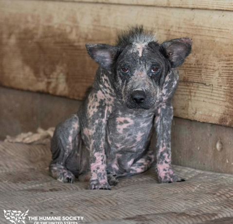 The release says the dogs appeared to have skin conditions from living in a filthy environment. Some of the dogs were kept in makeshift pens and crawled under trailers for shade.
