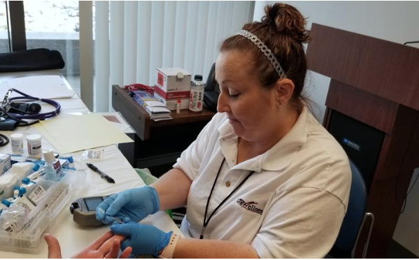 A worker draws blood during a health-care screening in Topeka. Health care jobs will be in high demand as Kansas’ population ages.