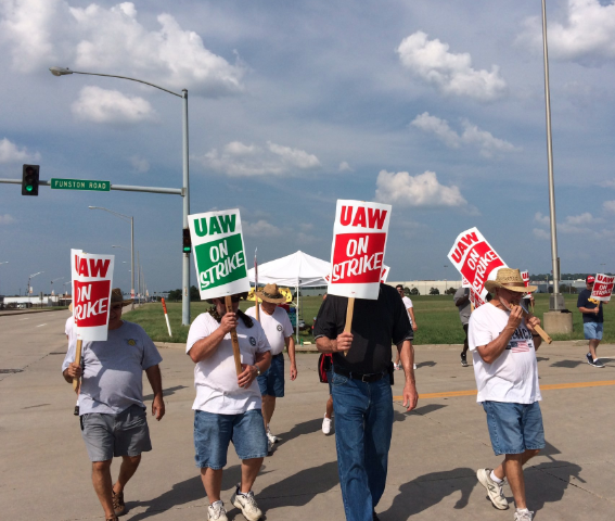 “I can’t see this lasting too long,” said machinist Clarence Trinity as he carried a union sign at GM’s engine and transmission factory in the Detroit suburb of Romulus, Michigan. “Both sides are losing bad.”