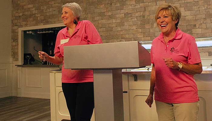 Wonder Women League Co-Chairs Rhonda Meyerhoff and Nancy Jeter speak at a League event Tuesday.