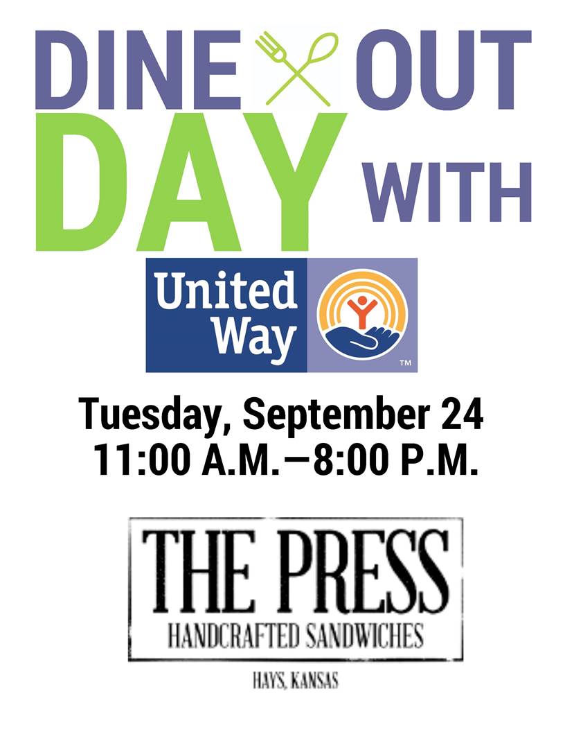 The United Way of Ellis County will be hosting their first Dine-Out Day this year with The Press on Tuesday, Sept. 24th from 11a.m. to 8 p.m. at 230 E. Eight S. in Hays. Come join us for lunch or dinner at The Press. A portion of the proceeds will benefit the United Way and their 17 partner agencies. Watch for upcoming Dine-Out Days with participating restaurants online at www.liveunited.us or Facebook at United Way of Ellis County. Call 785-628-8281 for more information.