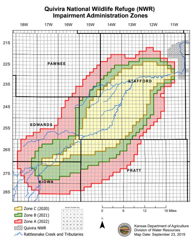More information related to the impairment complaint and investigation findings, the planned water administration, and plans to develop a WCA to provide flexibility can be found at agriculture.ks.gov/Quivira. Questions can also be addressed by calling KDA–DWR’s Stafford Field Office at 620-234-5311.
