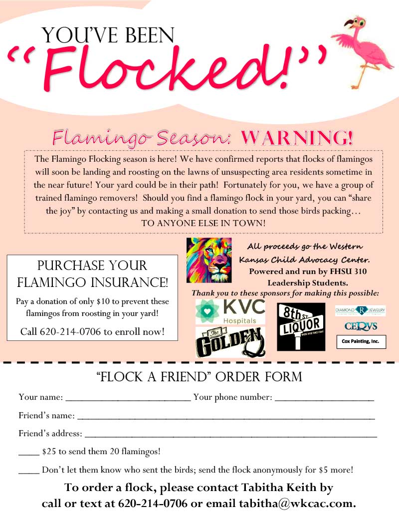 A fundraiser for the Western Kansas Child Advocacy Center is being conducted by a group of Fort Hays State University Leadership 310 students, and flocks of pink flamingos will roost around the city of Hays.
