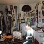 Over the years Kimple has also made many knives, grinding and polishing old files into blades, using deer antler and various woods, including Osage Orange for handles and making leather sheathes for each. One of his most recent projects is a full length leather scabbard for an old Henry .22 caliber rifle he owns. In 1980 he heard that a “log cabin camp” in Lyons was selling out, so he bought one of their little 12 x 14 Sears and Roebuck log cabins for just over $100 and moved it to their present home northwest of Hutchinson on a homemade trailer he built from an old tractor front end. These days he spends time out there most mornings working on leather and other projects of some sort.