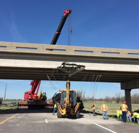 The impact with the bridge knocked the loader off of the semi trailer and scattered debris over all four lanes of the highway.